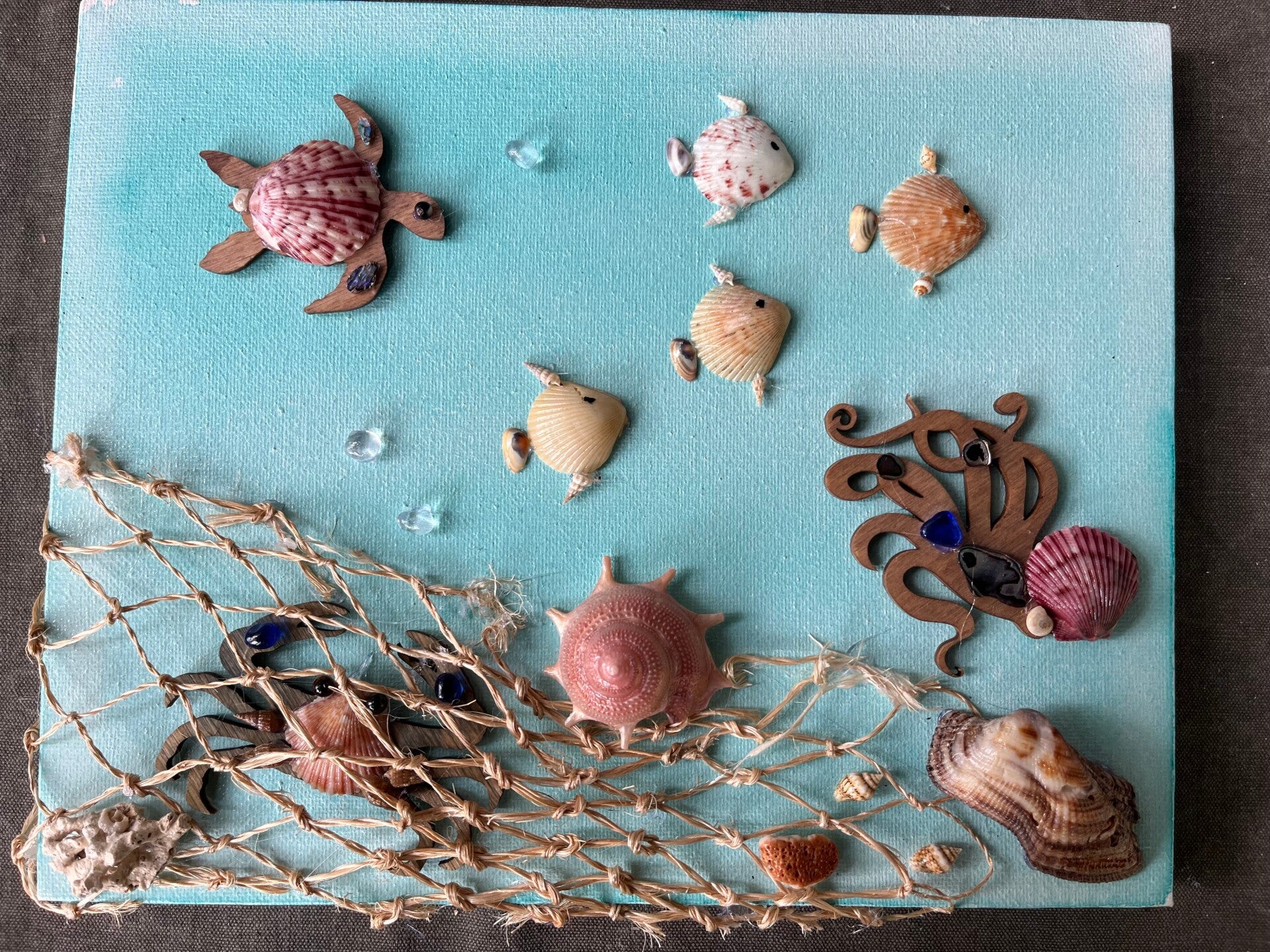 Handmade canvas with fish & turtles.Made from seashells, Seaglass and coral